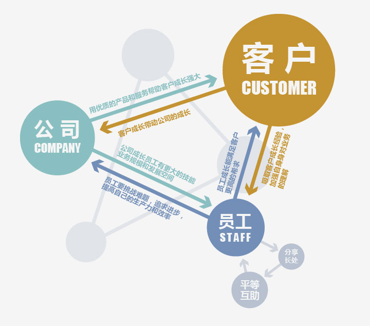激情敬業 責任 - 負責是做好工作的第一要求 創新 - 擁抱變化,主動創新,為客戶創造更多價值 成長 - 在變化中求自我成長,自我激勵 熱情 - 以樂觀的精神和必勝的信念投入工作中 |